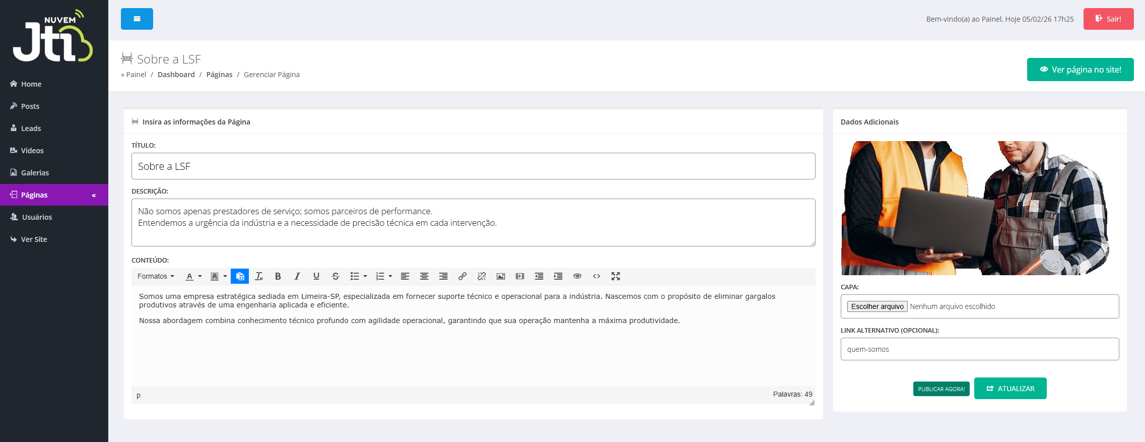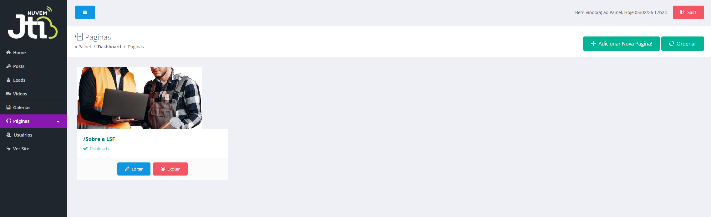 Objetivo: Gerenciar as páginas institucionais do site (visualizar, criar, editar, publicar e excluir).